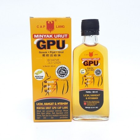Cap Lang GPU Minyak Urut adalah minyak gosok yang digunakan untuk membantu meredakan nyeri otot pegal linu nyeri sendi terkilir sakit punggung keseleo memar karena benturan memperlancar peredaran darah. Minyak dengan kandungan antioksidan vitamin dan nutrisi lainnya ini sudah digunakan selama berabad-abad untuk kesehatan kulit dan rambut lho. Promo khusus pengguna baru di aplikasi Tokopedia.